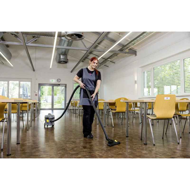 Odkurzacz T 11/1 Classic, który jest wszechstronny i łatwy w transporcie dzięki niskiej masie (jedynie 3,8 kg), to doskonały wybór dla użytkowników profesjonalnych, którzy często zmieniają obszar pracy. Przy wysokiej pojemności zbiornika (11 litrów) kompaktowe urządzenie w klasie wprowadzającej generuje podciśnienie na poziomie 235 mbar / 23,5 kPa z mocą 850 W, zapewniając doskonałe odkurzanie w krótkim czasie. Odkurzacz pracuje bardzo cicho, emituje jedynie 61 dB(A), co oznacza, że nie tylko chroniony jest użytkownik, ale również to, że pracę można wykonywać o dowolnej porze dnia w obszarach wrażliwych na hałas, takich jak szpitale lub hotele. Ergonomiczne kolanko gwarantuje długą pracę bez zmęczenia, nawet odkurzanie schodów jest bardzo łatwe dzięki zintegrowanemu uchwytowi do noszenia. Solidny design odkurzacza T 11/1 Classic zapewnia nie tylko długi okres eksploatacji — zderzak na jego całym obwodzenia zapobiega przewróceniu się urządzenia. Akcesoria, takie jak rura ssąca i ssawka podłogowa, można wygodnie przechowywać na odkurzaczu. Do odkurzacza dołączony jest również fizelinowy worek filtracyjny. Na życzenie dostępny jest również wysokowydajny filtr HEPA 14.