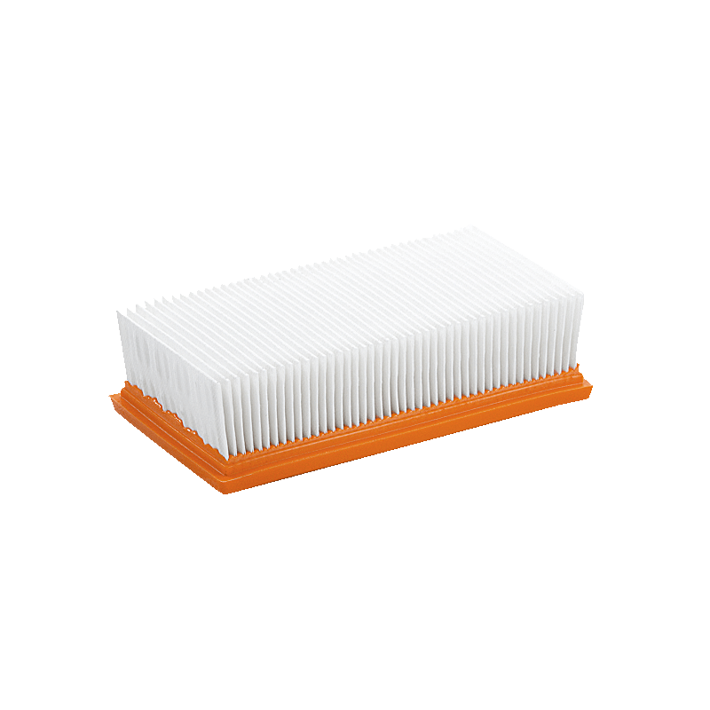 Płaski filtr falisty (PES) — BIA-C klasa pyłów M: fizelina poliestrowa odporna na procesy gnilne, idealna do zastosowań mokrych i zanieczyszczeń ściernych. Opcjonalny filtr główny do modeli NT 14/1 oraz NT 351 Eco/Professional.