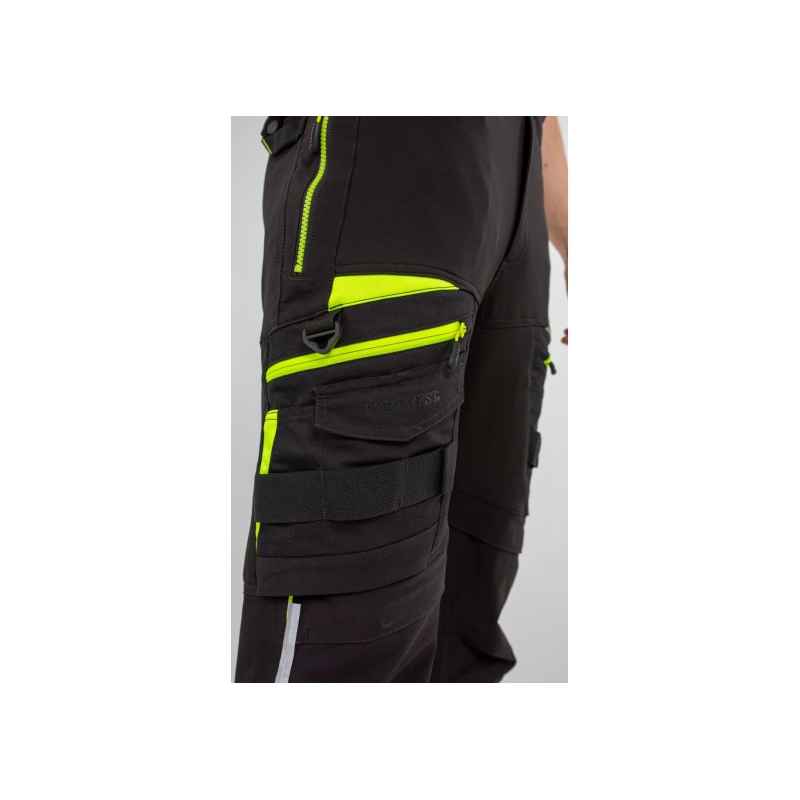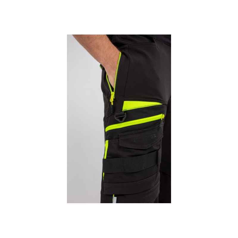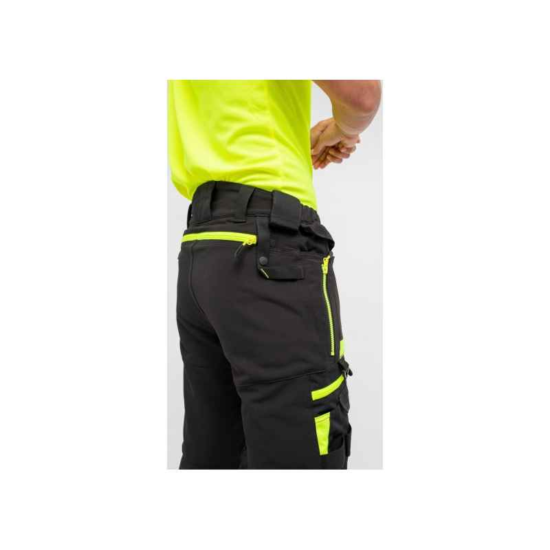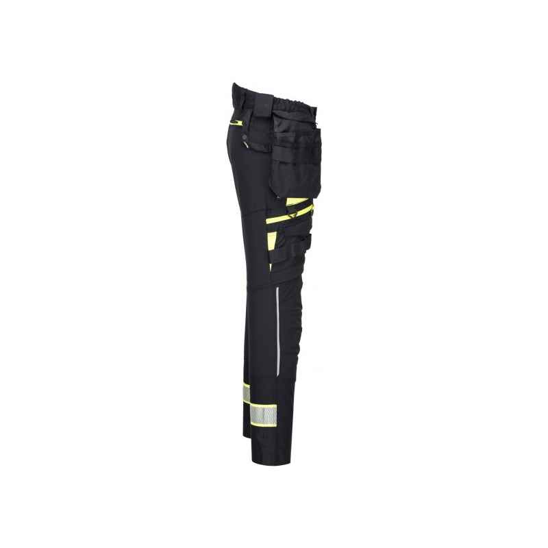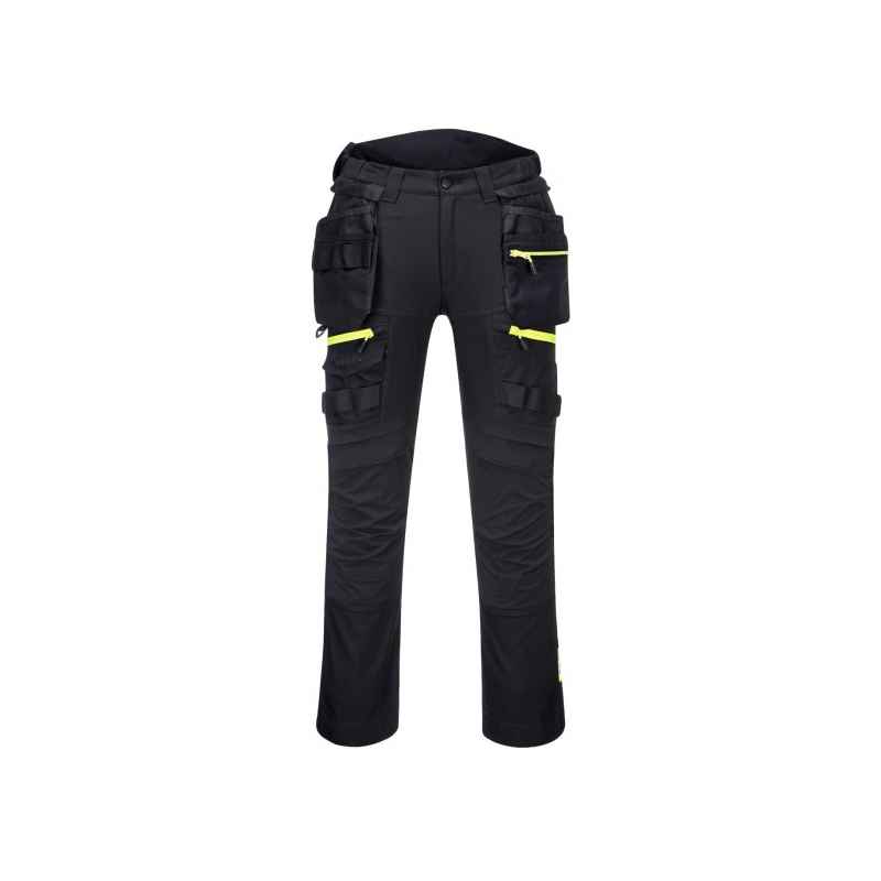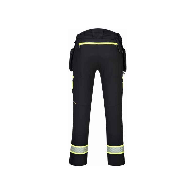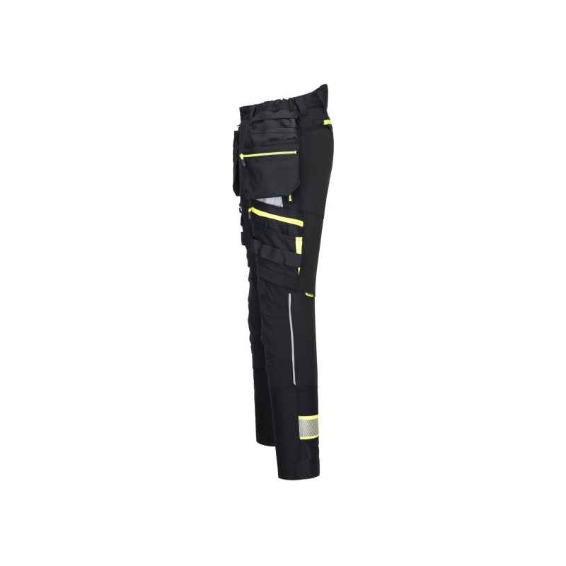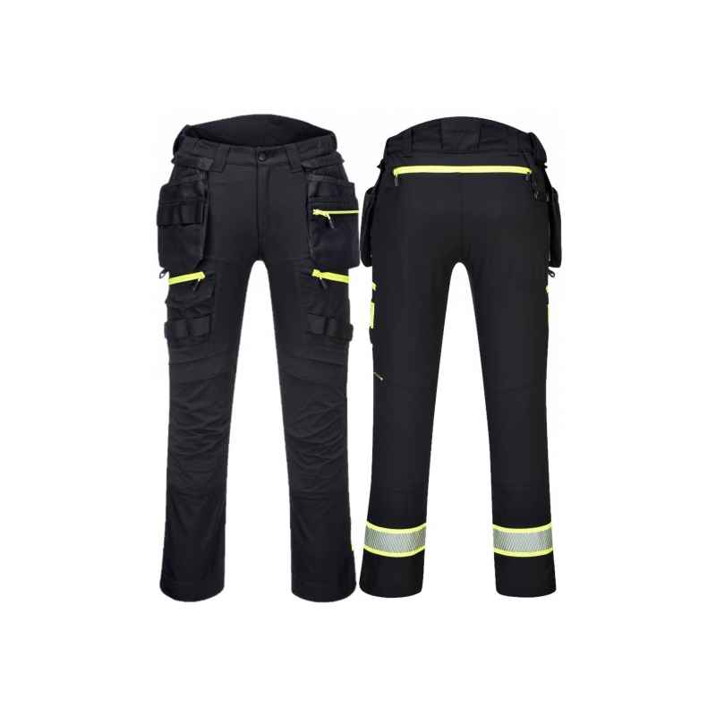 Spodnie DX4 z kieszeniami kaburowymi zostały ergonomicznie zaprojektowane i wykorzystują ukierunkowane rozmieszczenie dynamicznych materiałów stretch 4X, aby zapewnić maksymalny zakres ruchów podczas pracy. Posiadają wysoki pas z tyłu i są elastyczne z boku, zapewniając ochronę i komfort we wszystkich pozycjach roboczych. Wyposażone w uformowane regulowane kieszenie na nakolanniki, obszerne kieszenie przednie oraz wielofunkcyjne kieszenie na suwak zapewniające bezpieczne przechowywanie telefonu, długopisów i narzędzi. Potrójne szwy gwarantują maksymalną trwałość.