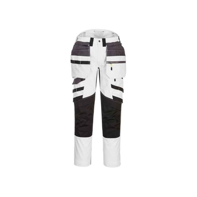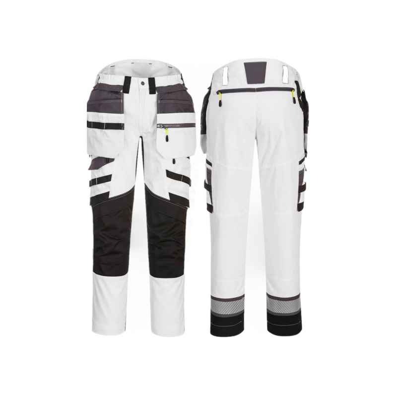 Spodnie DX4 z kieszeniami kaburowymi zostały ergonomicznie zaprojektowane i wykorzystują ukierunkowane rozmieszczenie dynamicznych materiałów stretch 4X, aby zapewnić maksymalny zakres ruchów podczas pracy. Posiadają wysoki pas z tyłu i są elastyczne z boku, zapewniając ochronę i komfort we wszystkich pozycjach roboczych. Wyposażone w uformowane regulowane kieszenie na nakolanniki, obszerne kieszenie przednie oraz wielofunkcyjne kieszenie na suwak zapewniające bezpieczne przechowywanie telefonu, długopisów i narzędzi. Potrójne szwy gwarantują maksymalną trwałość.