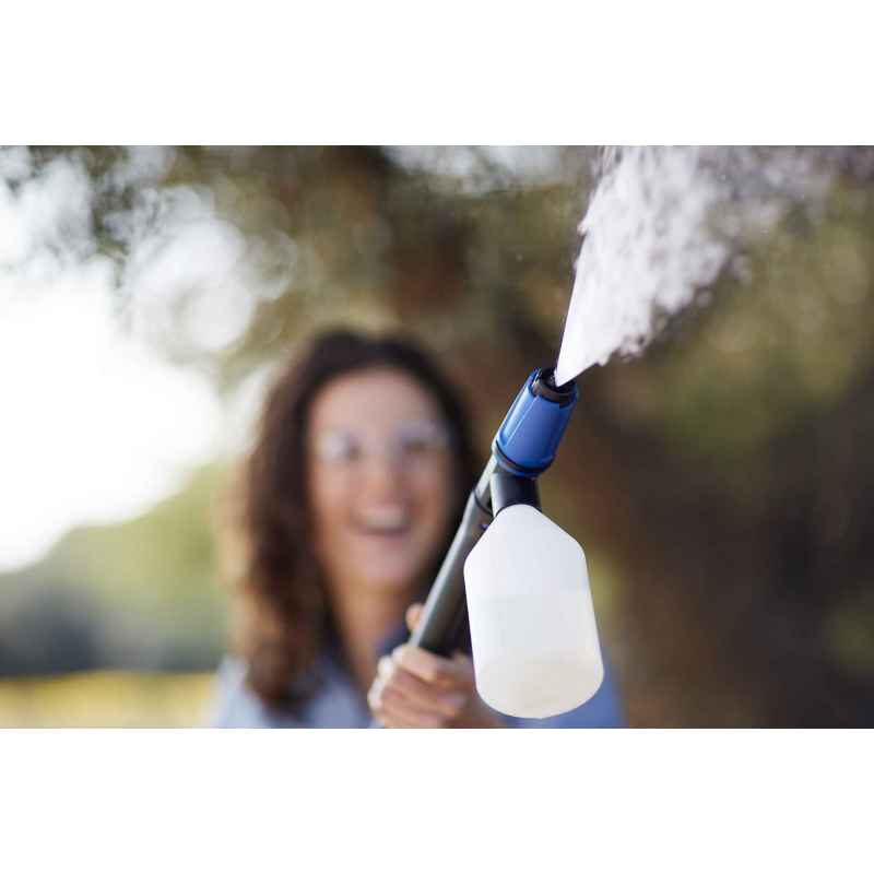 Nilfisk Super Foam Sprayer to zaawansowane akcesorium, które zapewnia szybkie i efektywne pokrycie powierzchni obfitą pianą. Dzięki nowoczesnej technologii, piana utrzymuje się dłużej na czyszczonej powierzchni, co zmniejsza potrzebę jej ponownego aplikowania. To rozwiązanie, które oszczędza do 30% detergentu w porównaniu z tradycyjnymi pianownicami.