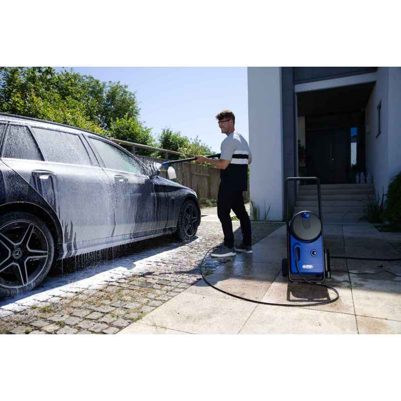 Myjka wysokociśnieniowa 190 bar z mosiężną pompą, silnikiem indukcyjnym i 12-metrowym wężem ze stalowym oplotem. Przepływ wody: 650 l/h, czas pracy ciągłej: 40 minut. Elastyczna regulacja ciśnienia, funkcja dozowania detergentu, wygodny schowek na akcesoria i teleskopowa rączka. Idealna do czyszczenia łodzi, maszyn rolniczych i powierzchni do 60 m²/h.