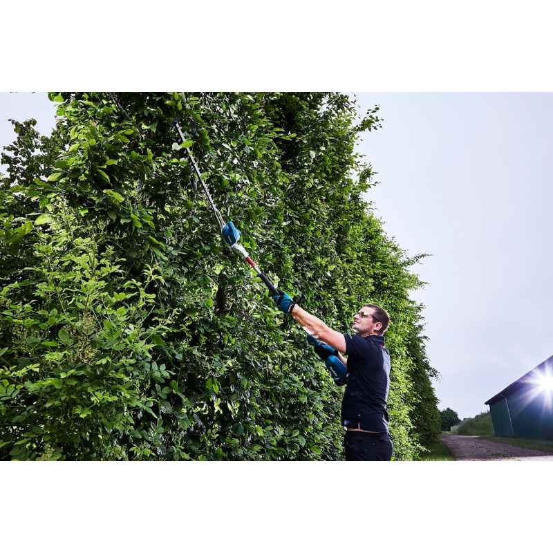 - Akumulatorowe nożyce do żywopłotu na wysięgniku zasilane akumulatorem 18 V Li-ion doskonałe do przycinania zarówno wyższych jak i niższych żywopłotów z poziomu ziemi
