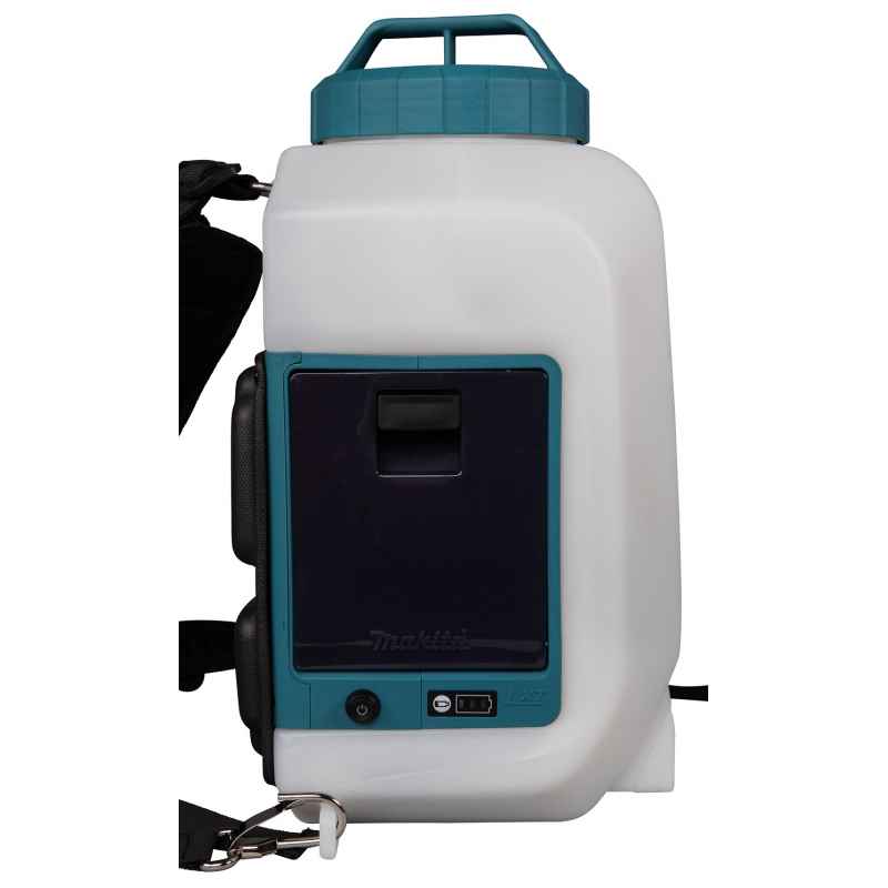 Akumulatorowy opryskiwacz plecakowy MAKITA DUS108Z to łatwe w użytkowaniu, lekkie do przenoszenia, a do tego bardzo ciche urządzenie. Posiada zbiornik o pojemności 10 litrów oraz uchwyt na lancę. Wyposażone jest w pompę membranową oraz podwójną dyszę w kształcie litery I, z szerokim kątem oprysku. Posiada możliwość wyczyszczenia opryskiwacza pod ciśnieniem wody z kranu. Opryskiwać wyposażony w technologie XPT (podwyższona odporność na pył i wilgoć) oraz Wet Guard (wysoka odporność na wodę, pozwalająca na użytkowanie urządzenia nawet w momencie, kiedy jest mokre). Wąż o długości 1,7 m pozwala na swobodną pracę, gdy opryskiwacz jest umieszczony na ziemi. Wygodnie umieszczony włącznik pozwala na łatwą kontrolę opryskiwania, wyposażony w blokadę do pracy ciągłej. Dobrze wentylowany tylny panel minimalizuje pocenie się operatora. Wygodne szelki minimalizują zmęczenie. Posiada główny włącznik zasilania oraz 3 stopniowy wskaźnik naładowania akumulatora. Łatwy demontaż akumulatora.