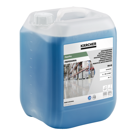 Wszechstronna opcja do czyszczenia posadzek i powierzchni, przemysłowy środek czyszczący FloorPro Industrial Cleaner RM 69 firmy Kärcher jest szczególnie imponujący w przypadku konserwacji i pośredniego czyszczenia konwencjonalnych posadzek przemysłowych.