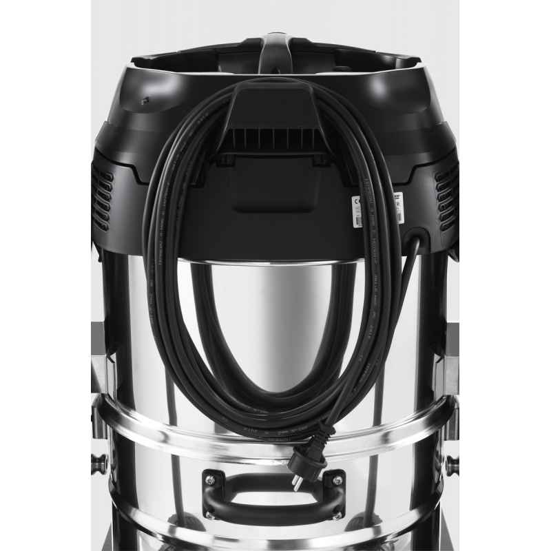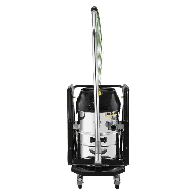 Przemysłowy odkurzacz klasy kompakt wyposażony w dwie mocne turbiny, wózek transportowy ułatwiający manewrowanie i zbiornik na znieczyszczenia ze stali szlachetnej.