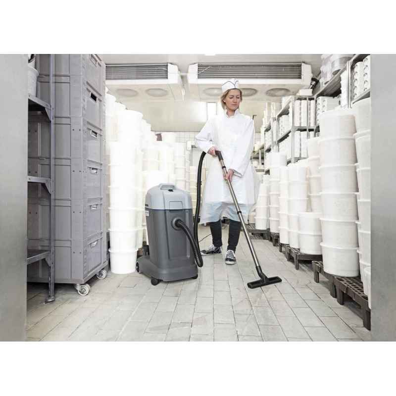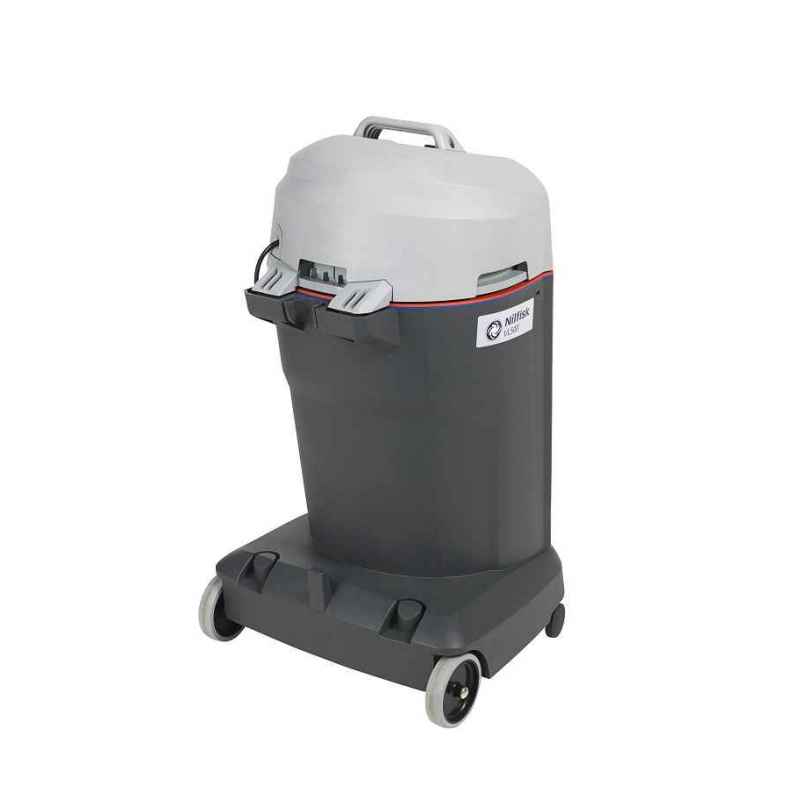 Przemysłowy odkurzacz klasy kompakt wyposażony w dwie mocne turbiny, wózek transportowy ułatwiający manewrowanie i zbiornik na znieczyszczenia ze stali szlachetnej.