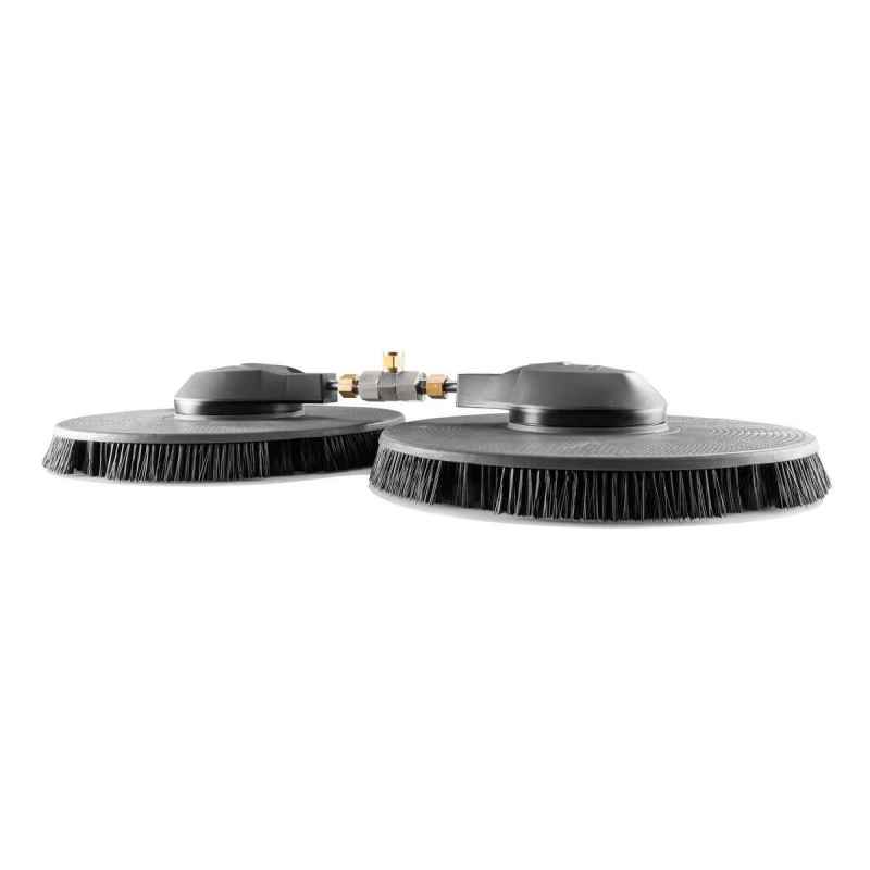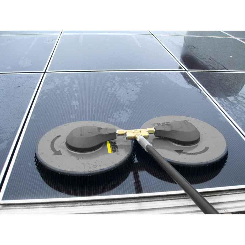 Słoneczne perspektywy! Napędzana przepływem wody szczotka iSolar 800 o szerokości roboczej 800 mm pasuje do myjek wysokociśnieniowych z przepływem wody na poziomie 700–1000 l/h. Szczotka iSolar 800 składa się z dwóch obracających się w przeciwnym kierunku szczotek dyskowych i służy do czyszczenia systemów fotowoltaicznych. Szczotki obracające się w przeciwnych kierunkach balansują siły poprzeczne, zapewniając optymalną obsługę. Elastyczny przegub na złączu głowicy szczotkowej ułatwia pracę. Dzięki niemu włosie leży płasko na powierzchni, co daje jednolite rezultaty czyszczenia. Głowicę szczotkową zaprojektowano do szczególnie dużych obszarów — idealnie nadaje się do czyszczenia dużych systemów, szczególnie na dachach.