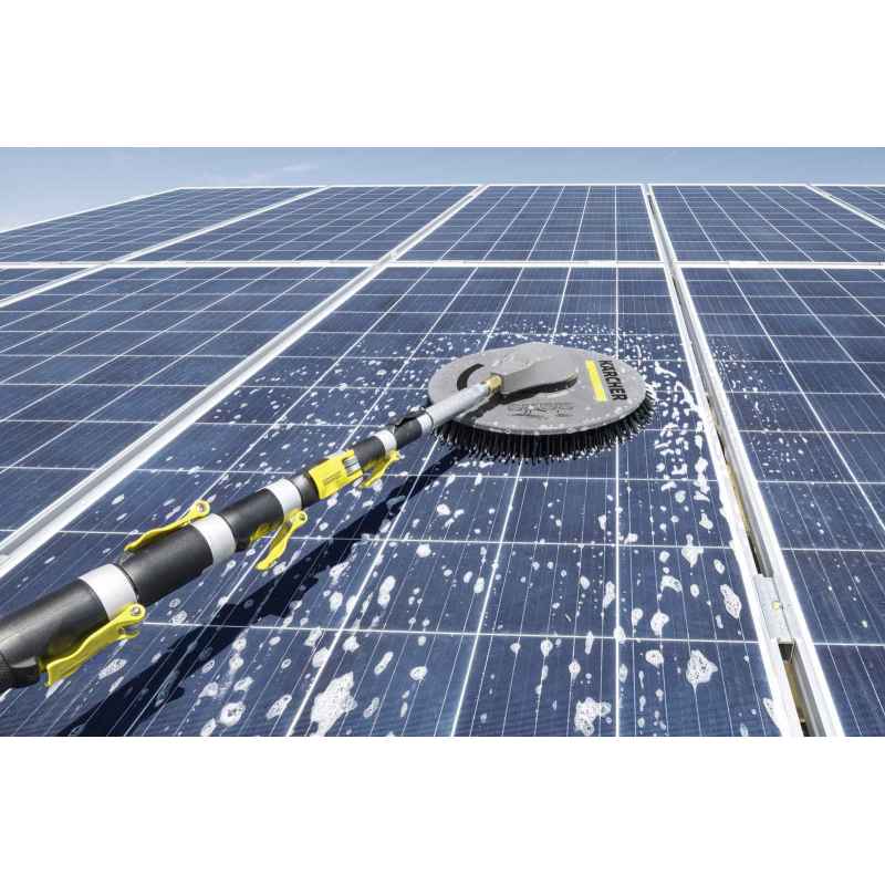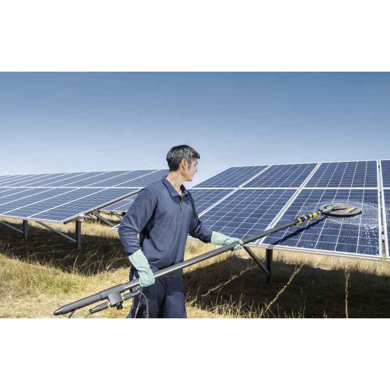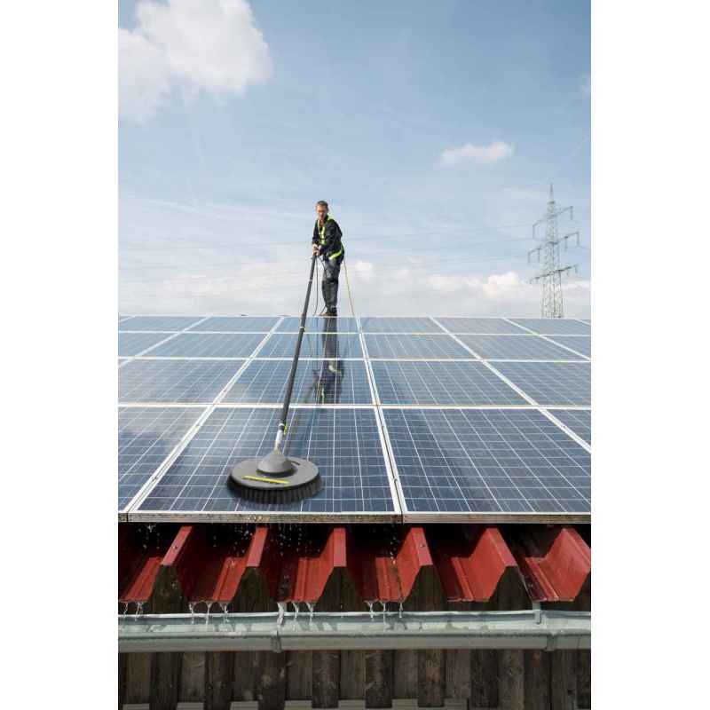 Napędzana przepływem wody szczotka dyskowa iSolar 400 pasuje do myjek wysokociśnieniowych z przepływem wody na poziomie 700–1000 l/h. Szczotka charakteryzuje się szerokością roboczą 400 mm i jest odpowiednia do czyszczenia mniejszych i średnich systemów fotowoltaicznych. Dzięki niewielkiemu ciężarowi i łatwej obsłudze można wygodnie czyścić systemy montowane na wysokości.