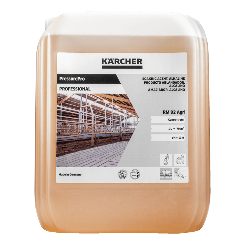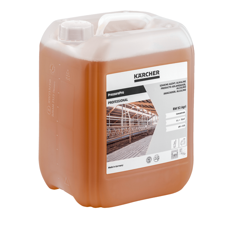 Alkaliczny środek PressurePro Soaking Agent RM 92 Agri to znakomity wybór do wstępnego czyszczenia przed sięgnięciem po pianę RM 91 Agri. Kärcher zaleca stosowanie go do zlikwidowania wyjątkowo uporczywych i trudnych do usunięcia organicznych zanieczyszczeń w budynkach dla drobiu, trzody chlewnej i bydła oraz halach udojowych. Dzięki specjalnej konsystencji piana przylega również do pionowych powierzchni i rozpuszcza zanieczyszczenia, zanim zostaną całkowicie usunięte. To generuje finansowe i ekologiczne korzyści, ponieważ równoczesne namaczanie skraca czas czyszczenia i ilość potrzebnej wody. Formuła zawiera inhibitory korozji chroniące powierzchnie i przedmioty w oborze.