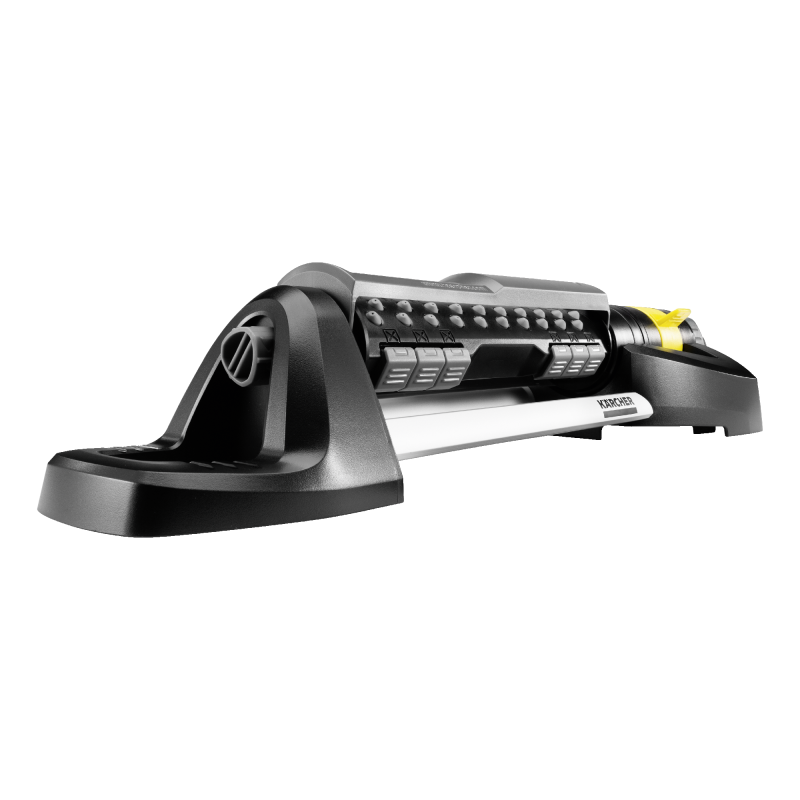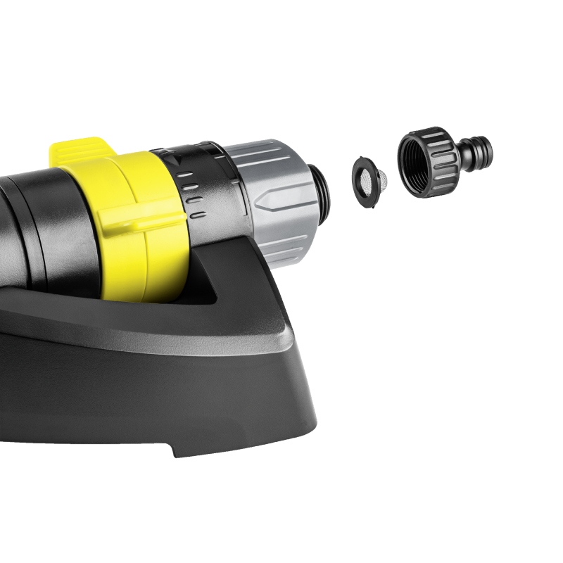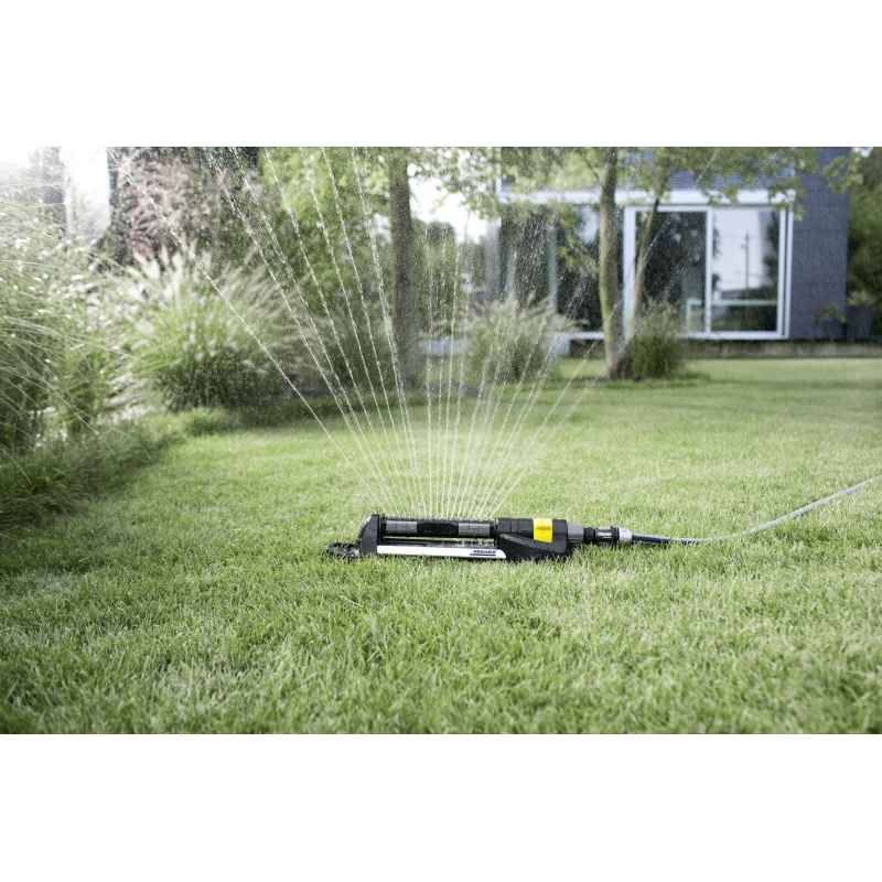 Innowacyjny zraszacz z regulowanym wydatkiem wody (0-maks.). Szerokość spryskiwania można zmniejszyć poprzez wyłączenie części dysz. Wyposażony w zdejmowane szpile. Wśród licznych innowacji, charakteryzujących tą grupę produktów szczególnie warte uwagi jest proste rozwiązanie stosowane w zraszaczach oscylacyjnych Kärcher. Polega ono na wyposażeniu urządzenia w specjalne przesłony umożliwiające zmianę ustawień zraszania bez ryzyka ochlapania wodą osoby obsługującej. Zraszacz współpracuje z systemem szybkozłącza, dlatego jest łatwy w podłączeniu do węża ogrodowego.